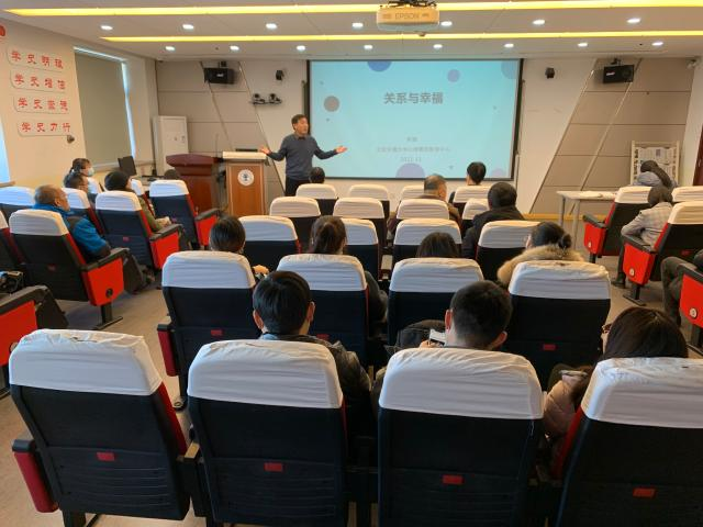 学校心理素质教育中心副主任张驰老师为全院教工做了“关系与幸福”的心理辅导讲座。张驰老师从分析人的两个系统的关系为切入点,分析了人的根本困扰,告诉我们通过接纳和整合家庭认可和社会认可,进行自我比较以提升幸福感。