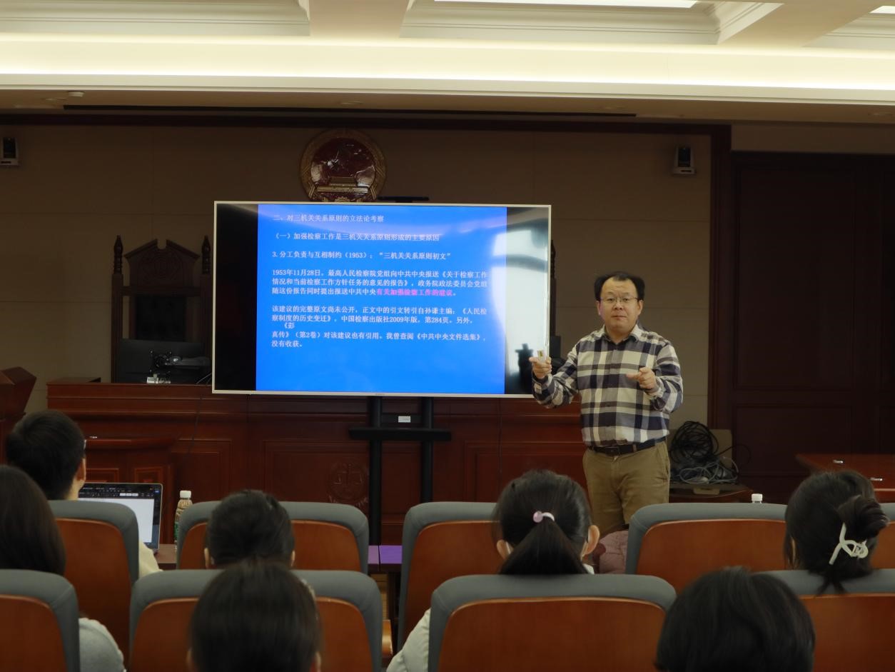 2023年11月23日,思源法学论坛第十二期在思源西楼模拟法庭举办。为进一步加深学生对法学理论知识的理解和运用,提升法学素养,本次邀请了中国社会科学院研究所副研究员、中国法学会法理学研究会理事田夫老师作题为“‘法检公’三机关关系原则的教义学展开”的专题讲座。中国政法大学水晶直播 副教授王迎龙老师、水晶直播 副教授裴洪辉老师作为与谈人,水晶直播 助理教授黄琳老师担任主持人。七十余名水晶直播 本科生、研究生到场参加。