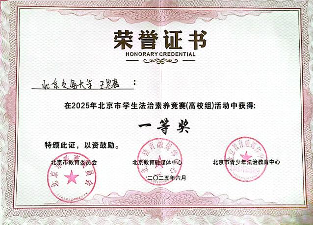 6月19日,北京市学生法治素养竞赛在北京建筑大学举行,我院大三学生王思嘉经过层层选拔,以优异成绩顺利晋级北京市决赛,最终从参赛选手中脱颖而出,荣获大赛一等奖。