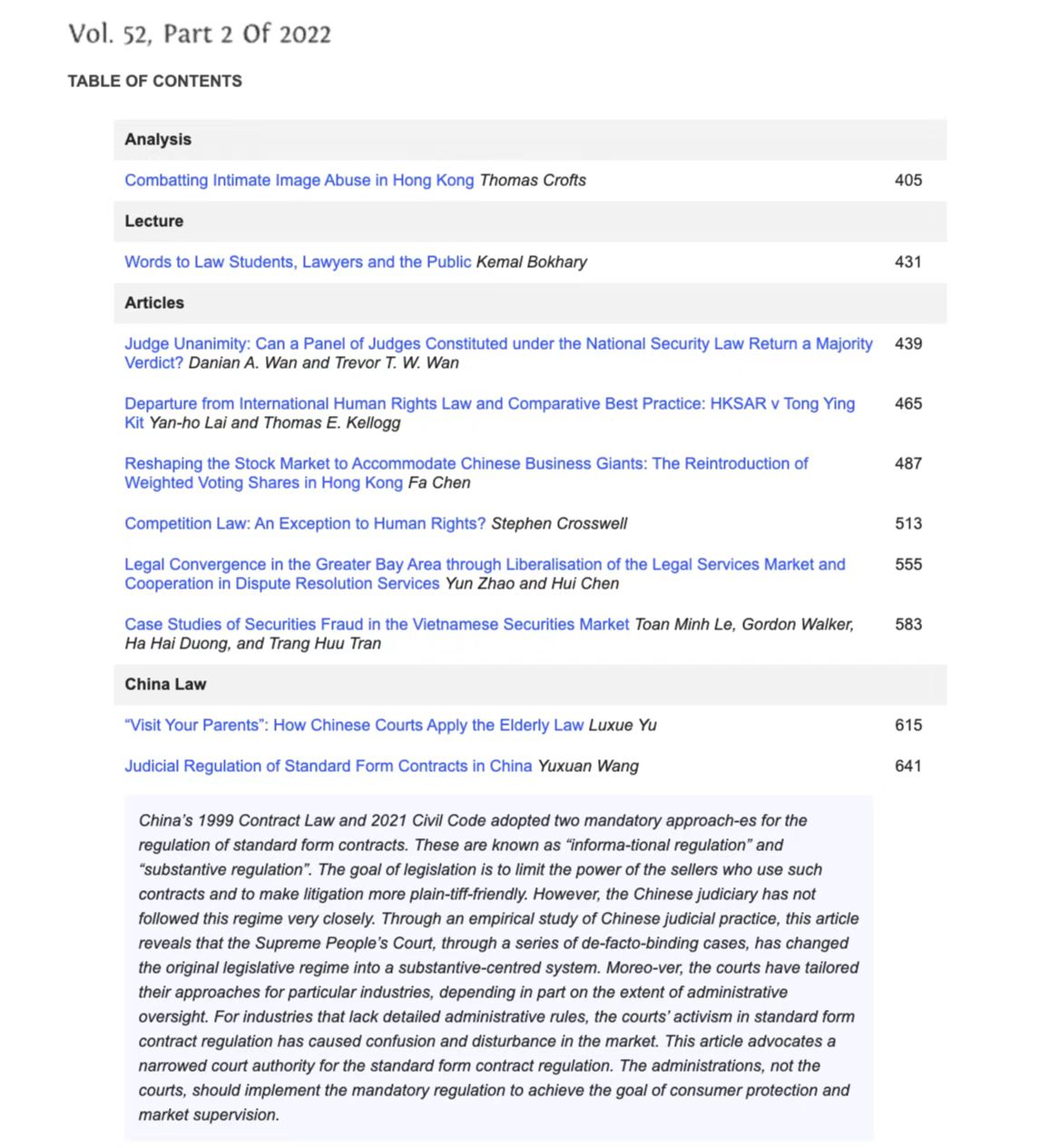 《Hong Kong Law Journal(香港法律学刊)》近期刊发了水晶直播 教师王俣璇的论文《Judicial Regulation of Standard Form Contracts in China(中国格式条款的司法规制)》。