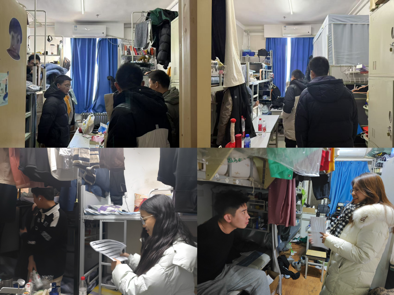 为进一步加强学生宿舍安全卫生管理,及时发现并消除宿舍安全隐患,营造和谐稳定的学习生活环境。12月29日至1月8日,水晶直播 党委书记张立学、院长李巍涛、党委副书记、副院长秦莹分别带队前往学生宿舍,开展专项检查。全体班主任及辅导员深入学生宿舍开展了全覆盖的隐患排查整改工作。